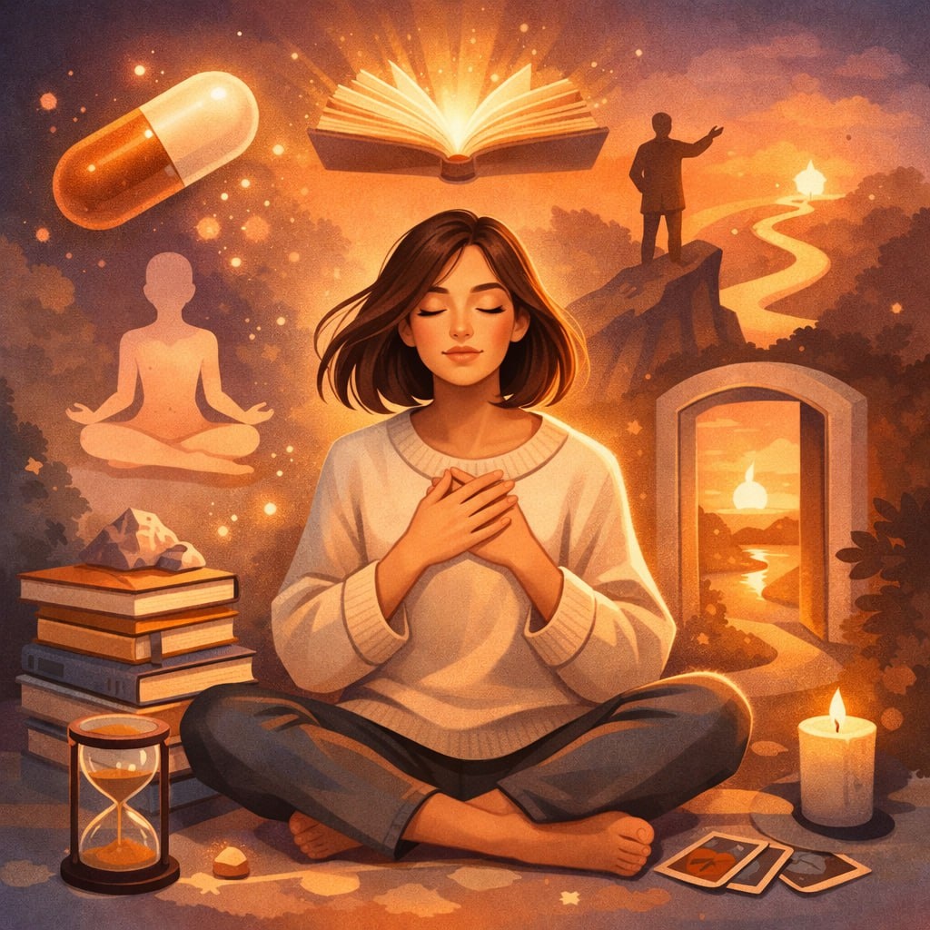 Знаем это умом. Читали. Слышали. Соглашались. И всё равно — ищем. Ищем книгу, которая всё объяснит. Практику, после которой «отпустит». Человека, который скажет: делай вот так — и всё сложится. Почему? Потому что внутри очень устало. Потому что хочется не работать над собой, а перестать страдать. И в этом нет слабости. Есть живое человеческое желание: чтобы стало легче. Сейчас. Без очередного усилия. Мы ищем волшебную таблетку не потому, что наивны. А потому что слишком долго жили в режиме «терпи», «разберёшься потом», «соберись». Но правда в том, что не существует таблетки, которая сделает жизнь вашей, если вы сами в ней не присутствуете. Ни одна техника не сработает, если вы не слышите себя. Ни один метод не поможет, если вы снова делаете «как надо», а не как откликается. И всё же… Есть кое-что, что многие путают с волшебной таблеткой. Это момент, когда вы перестаёте искать решение снаружи и впервые честно поворачиваетесь к себе. Не чтобы чинить. А чтобы услышать. Иногда