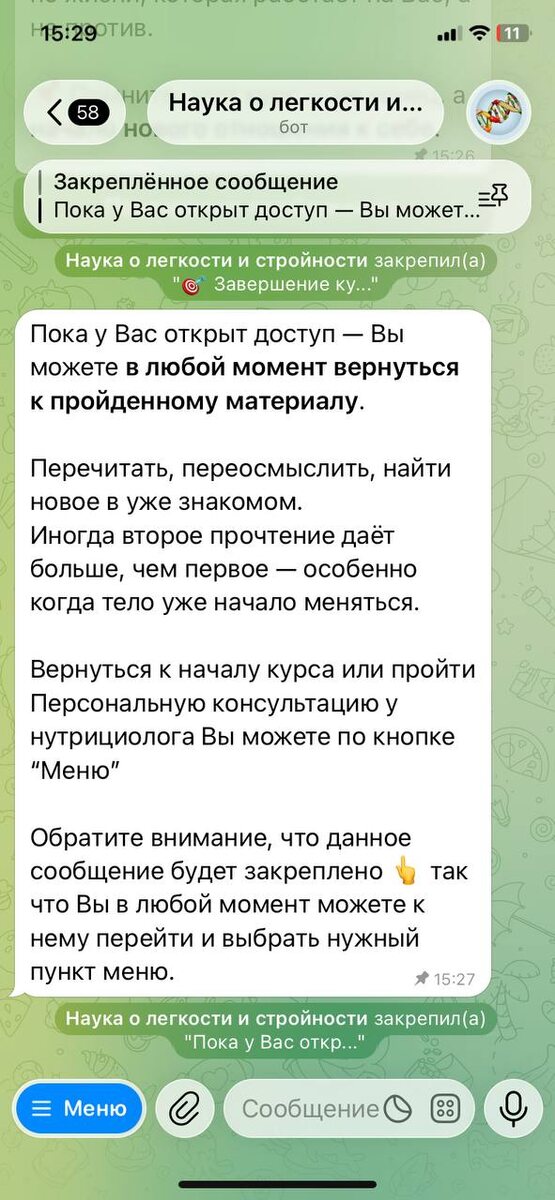 Почему формат бота — это не «упрощение», а забота Когда мы говорим о курсе, часто возникает вопрос: «А почему бот?» Кажется, что это что-то автоматическое и бездушное. На самом деле — всё ровно наоборот. Мы выбрали формат бота не ради удобства для нас, а ради комфорта и устойчивости для вас. Потому что изменения в теле не любят давления. Им нужен ритм, опора и ощущение, что вам не нужно быть идеальной. 🔹 1. Вы идёте в своём темпе, а не «по расписанию» В боте нет жёсткого графика, дедлайнов и ощущения: «я не успела — значит, всё пропало». Один урок — один день. 5–10 минут. Простым, человеческим языком. Без заумных схем и без ощущения, что вы «что-то не понимаете». Наша задача — не впечатлить вас, а объяснить так, чтобы вы могли применять это в жизни. Если сегодня: — завал на работе, — дети, — усталость, — или просто нет ресурса — ничего не ломается. Вы возвращаетесь тогда, когда можете. ✨ Доступ к курсу открыт 4 месяца — этого времени достаточно, чтобы спокойно пройти все