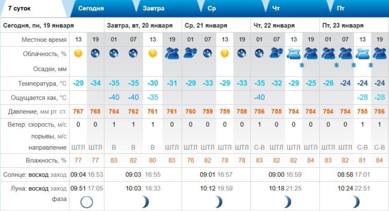 Сегодня, 19 января, днём столбик термометра покажет отметку -29 градусов, небо будет ясным, осадков синоптики rp.5 не прогнозируют, будет и абсолютное безветрие. Во вторник ночью -35 (по ощущениям -40), днём -30 (по ощущениям -35), по-прежнему ясно и без осадков, ветер восточного направления и 1 м/с. В среду и четверг в тёмное время суток до -35, в светлое -29, ясное небо в четверг станет пасмурным и не исключен небольшой снег, в эти дни полное безветрие. В пятницу ночная температура воздуха составит -26, дневная достигнет -24, пасмурно, в течение суток небольшие осадки, ветер северо-восточный 1 м/с.