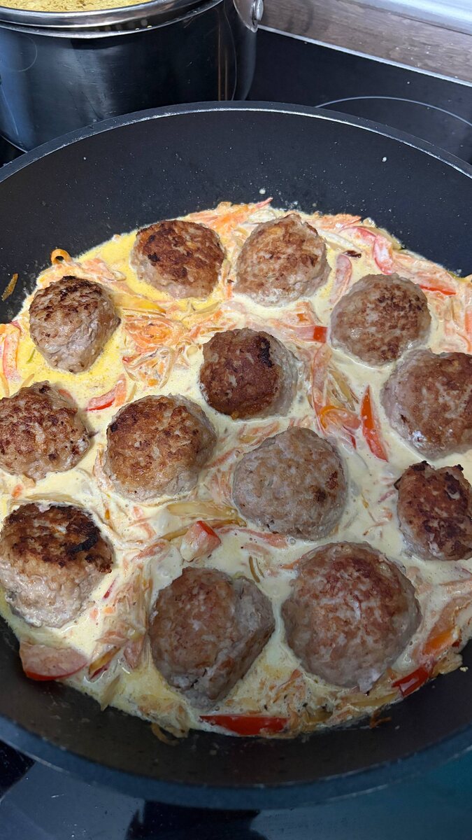 Ингредиенты: Фарш индейки Сухари панировочные Яйцо Лук Морковь Перец болгарский Сливки 33% Макароны Приготовление: В фарш добавляем измельченный лук, соль, специи (у меня паприка), яйцо, 1,5-2 ст.л. панировочных сухарей. Тщательно перемешиваем. Формируем шарики. Обжариваем на растительном масле до золотистой корочки. Выкладываем в тарелку. Нарезаем лук и болгарский перец полосками, морковь также режем или трем на крупной терке. Жарим на той же сковороде сначала лук и морковь, потом к ним добавляем перец. Когда овощи стали мягкими добавляем сливки и солим. Убавляем огонь до среднего или чуть ниже, перемешиваем. Выкладываем в соус фрикадельки и тушим под крышкой до готовности. Макароны варим отдельно. #ужин #фарш #макароны