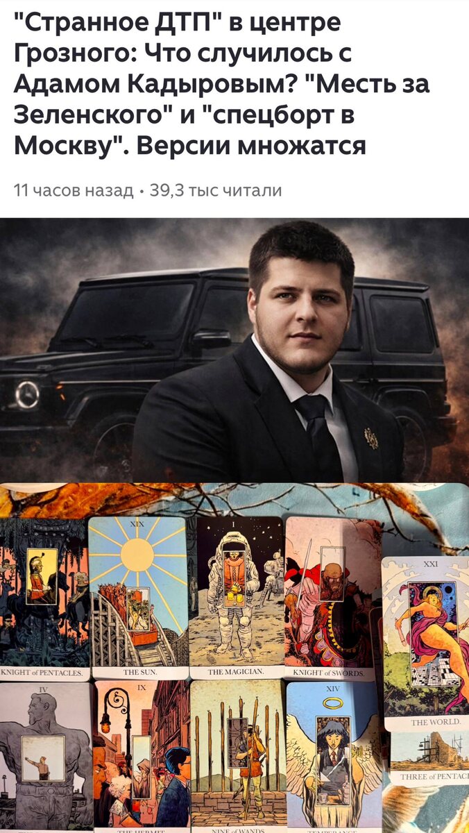 Помнится, просили сделать расклад на здоровье Рамзана и все там было не так, чтобы плохо, как говорили, а теперь вот история с Адамом. Отец и сын умеют нагнать шороху, остается только по картам и смотреть, что там с ними… Было ли ДТП? Да, специально подгадывали, чтоб наследника Кадырова прищучить (Солнце), по аркану Маг организатор известное лицо при власти, на вопрос о Зеле карты ответили положительно. Что сейчас с Адамом? По рыцарь пентаклей состояние стабильное, но пострадали (погибли) другие люди (Мир, 3 пентаклей). Если судить по двум рыцарям, пострадала верхняя часть тела (удар головой), так как возможно, Адам сам управлял авто (маг, рыцарь мечей). Аркан Умеренность часто показывает состояние между «небом и землей»—без сознания, но жив. Что с Рамзаном? В раскладе много старших арканов, поэтому ситуация серьезная, — отец сейчас мобилизовал все свои силы (Император), а может, не только свои (Солнце), Кадыров подавлен, но не сломлен. Аркан Отшельник—поиск решения, виновных, борь