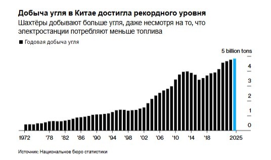 из-за увеличения объёмов более чистой электроэнергии. При этом Пекин продолжает уделять приоритетное внимание энергетической безопасности. Согласно опубликованным в понедельник правительственным данным, в 2025 году добыча угля выросла до 4,83 млрд тонн, что на 1,2% больше, чем в предыдущем году, несмотря на волну проверок безопасности, которые привели к сокращению добычи во второй половине года. Выработка тепловой энергии снизилась на 1%, что стало первым годовым снижением за последнее десятилетие. Расходящиеся тенденции указывают на наличие конкурирующих интересов, поскольку Китай пытается создать более чистую и эффективную энергосистему, не ставя под угрозу свою энергетическую безопасность. Добыча природного газа достигла нового максимума 33-й год подряд, в то время как добыча сырой нефти побила рекорд, который держался с 2015 года. Эти виды топлива меркнут по сравнению с важностью угля для Китая. Эта азиатская страна добывает и потребляет более половины мировых запасов самого заг