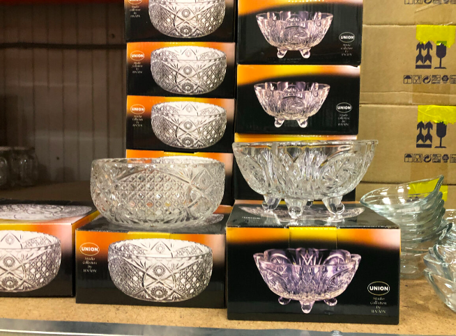 Есть и несколько вариантов салатников. Один из них — набор «Палитра» из 6 салатников объёмом 400 мл и диаметром 13 см. Изготовлены в России, г. Гусь-Хрустальный. Цена набора 373 рубля.