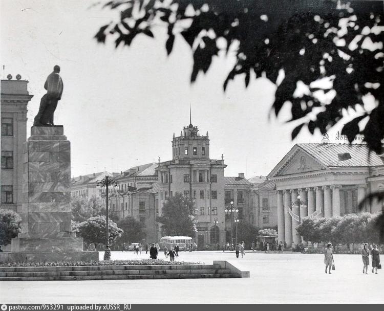 Описание: Площадь Ленина. Вид на памятник Ленину, Драматический театр и дом мясокомбината.