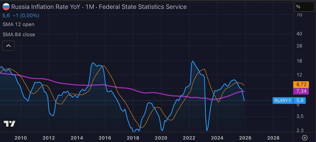 Годовая инфляция опустилась ниже своей 7 летней МА (медленная фиолетовая 💜).