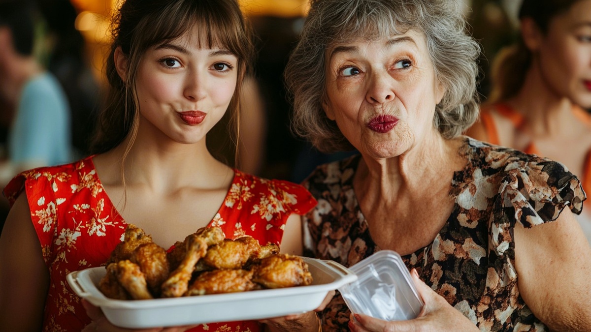 Людмила Петровна стояла у стола, склонившись над блюдом с оливье. В её руках была большая ложка, которой она методично, почти хирургически точно, перекладывала салат в прозрачный пластиковый контейнер. Рядом, у подоконника, Наталья сосредоточенно перебирала канапе на подносе, откладывая в сторону те, что с сёмгой.