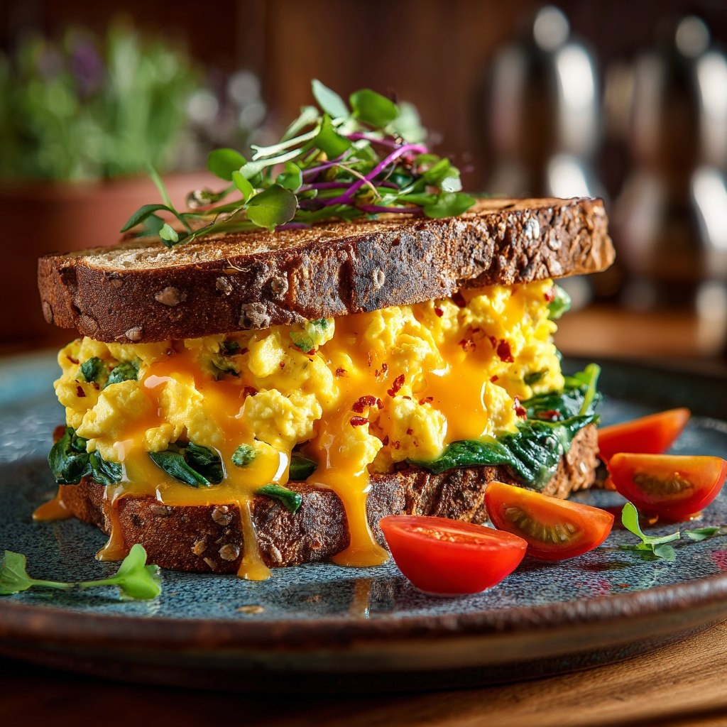 Ингридиенты - 2 ломтика хлеба (целозернового или ваш любимый) - 2 яйца - Щепотка соли - Щепотка перца - 1 столовая ложка сливочного масла - 1 горсть свежего шпината - 2 ломтика сыра чеддер или другой по вкусу - 1 столовая ложка оливкового масла Способ приготовления 1. В небольшой миске взбейте яйца с солью и перцем. 2. Разогрейте сливочное масло на сковороде на среднем огне, влейте яйца и готовьте омлет, переворачивая один раз, пока он не будет готов. 3. Разогрейте оливковое масло в другой сковороде и слегка обжарьте шпинат, пока он не станет мягким. 4. На один ломтик хлеба положите омлет, затем шпинат и сыр, накройте вторым ломтиком хлеба. 5. Обжарьте сэндвич на сухой сковороде или тостере, пока хлеб не станет золотистым и сыр не расплавится. 6. Разрежьте сэндвич пополам и подавайте горячим.