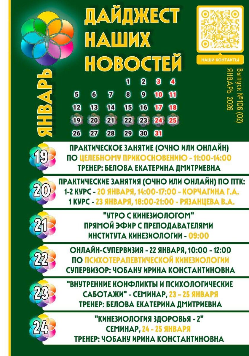 19 ЯНВАРЯ - Практическое занятие по Целебному прикосновению 20 ЯНВАРЯ - Практическое занятие по Психотерапевтической кинезиологии — 1-2 курс 21 ЯНВАРЯ - Утро с кинезиологом! 22 ЯНВАРЯ - Супервизия 23 ЯНВАРЯ - Внутренние конфликты и психологические саботажи 23 января - Практическое занятие по Психотерапевтической кинезиологии — 1 курс 24-25 ЯНВАРЯ - Кинезиология здоровья-2 ➡ ЗАПИСАТЬСЯ НА СЕМИНАРЫ ИЛИ ЗАДАТЬ ВОПРОС ⬅ 🔴 Наш сайт 🔴 🔴 Наши контакты 🔴 #Институт_Кинезиологии #Кинезиология #Кинезиолог #Чобану_И_К #Целебное_прикосновение #Психотерапевтическая_кинезиология