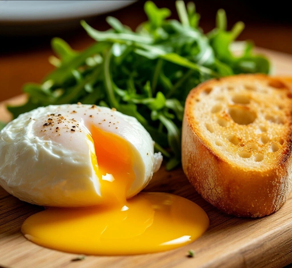 ПОЧЕМУ ЭТО ШЕДЕВР? 🎨 Контраст температур и текстур:горячее нежное яйцо, теплый хрустящий хлеб и прохладный, тающий во рту сливочный сыр. Это утренняя симфония для истинных гурманов.
