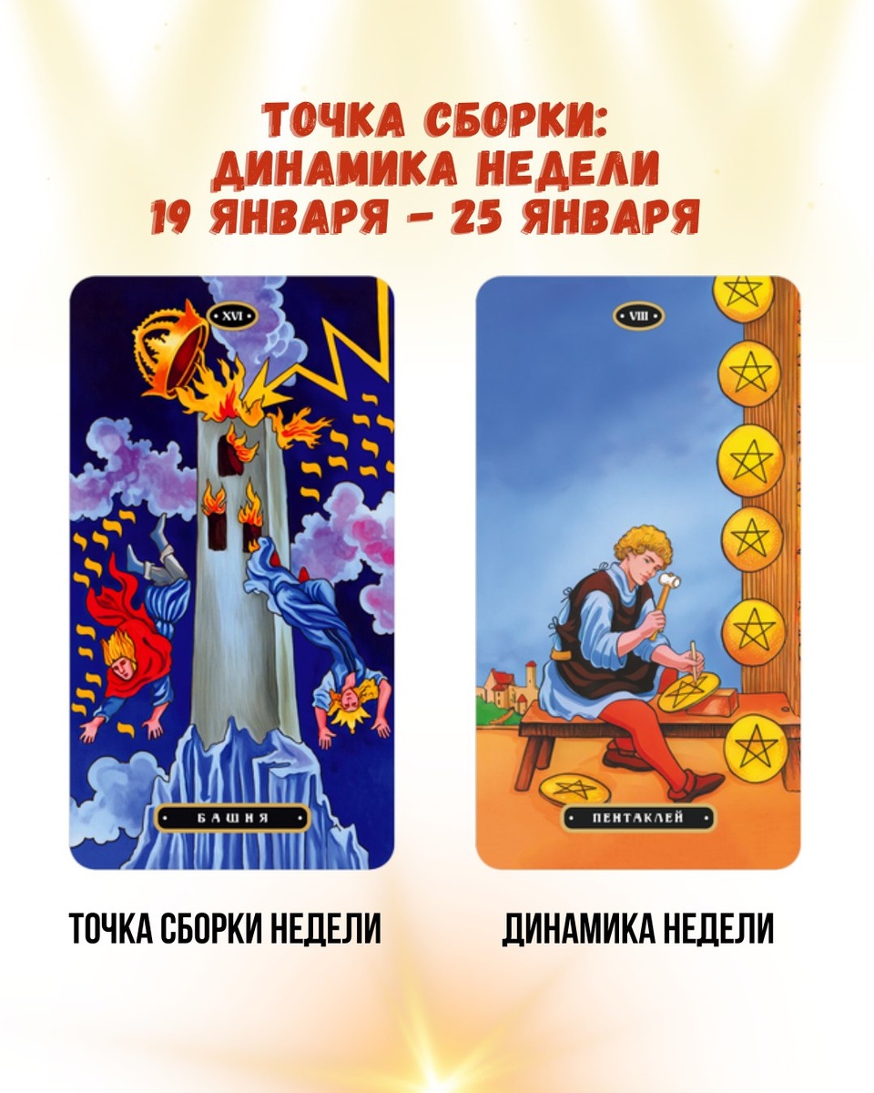 🔘🔘🔘🔘🔘 🔘🔘🔘🔘🔘🔘: ДИНАМИКА НЕДЕЛИ 1⃣ ТОЧКА СБОРКИ НЕДЕЛИ — Башня На этой неделе точка сборки — резкое прояснение через слом. Башня приходит не разрушать тебя, а разрушать то, что давно держалось на иллюзиях. Это может быть: 🤝внезапная новость, 🤝резкое осознание, 🤝обрыв договорённостей, 🤝момент «я больше так не могу». Башня всегда честна и быстра. Она не торгуется, не уговаривает и не даёт отсрочек. Энергетическое состояние недели: резкое, электрическое, отрезвляющее. 2⃣ ДИНАМИКА НЕДЕЛИ — 8 Пентаклей После встряски включается режим дела и концентрации. 8 Пентаклей — это: ✔восстановление через работу, ✔сбор себя по частям, ✔внимание к деталям, ✔спокойная системная деятельность. Внешние события будут требовать не эмоций, а рук, фокуса и регулярности. Меньше слов — больше процесса. 3⃣ КЛЮЧЕВОЙ СМЫСЛ СОЧЕТАНИЯ Башня + 8 Пентаклей = «Слом → навык → новый фундамент». То, что рухнет, больше не подлежит ремонту. Зато появляется шанс: 💕научиться по-новому, 💕выстроить усто