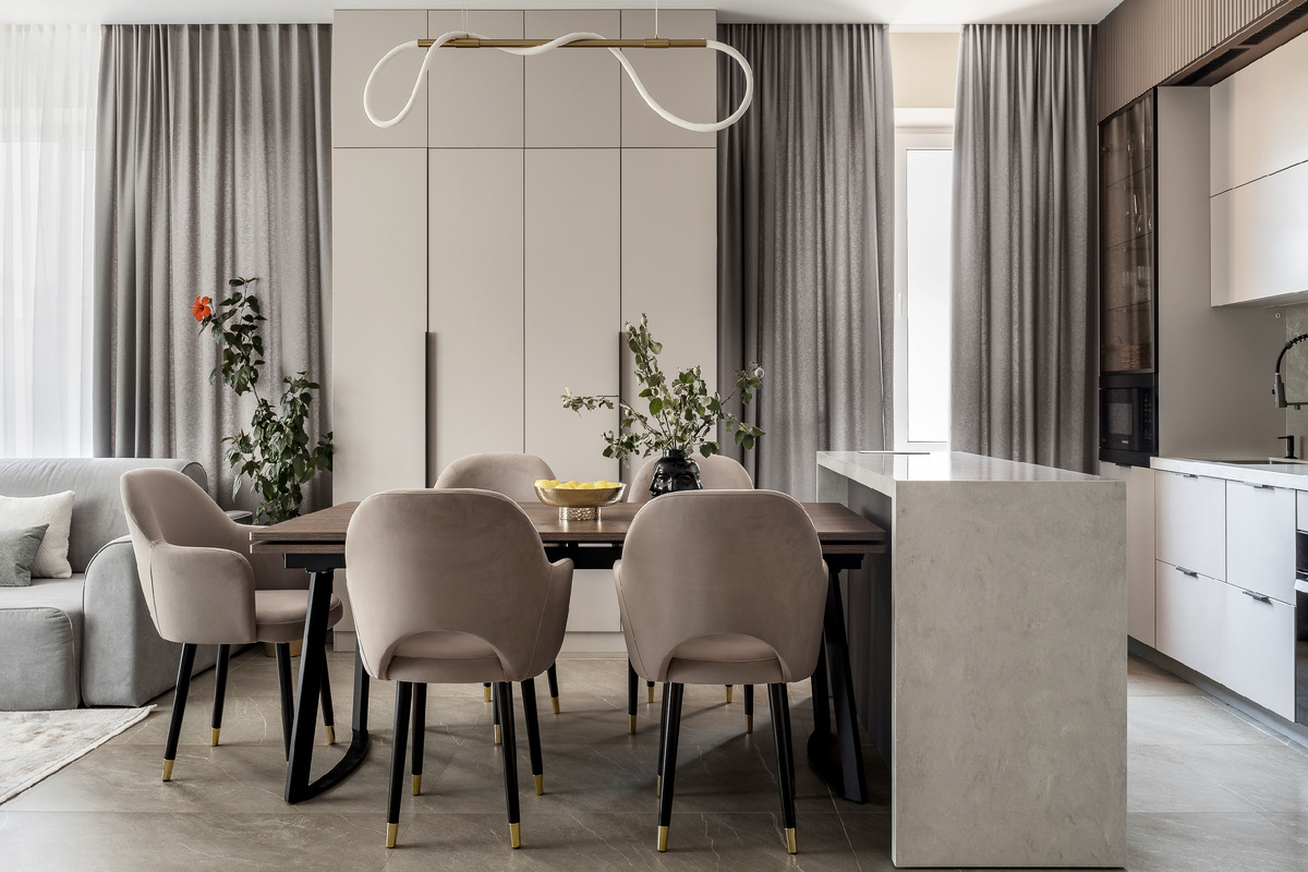 В этом доме будет жить семья из трех человек: супруги с пятилетней дочерью и любимый кот Шурик. Интерьер получился уютным и одновременно функциональным, с разумной эргономикой. Заглянем в гости. Одноэтажный дом был куплен с черновой отделкой и стандартной планировкой. Здесь есть просторная кухня-гостиная, мастер-спальня с мастер-санузлом, отдельная детская спальня и выделенная игровая зона. 42-метровая комната разделена на кухню с островом и обеденной зоной, а также гостиную. Скрытая дверь ведет из кухни в кладовку-постирочную. Шкаф-витрина у окна с подсветкой «облегчает» конструкцию. В простенке между окнами расположен высокий шкаф с антресолями. Обратите внимание: для фартука кухни использовали керамогранит из той же коллекции, что и напольное покрытие, что позволило избежать цветовых и фактурных несоответствий. Прием: акцентная стена за телевизором в гостиной оформлена рейками из ЛДСП и мебельным листом под камень. Тумба под ТВ, стеллаж и шкаф изготовлены из тех же материалов. Это п