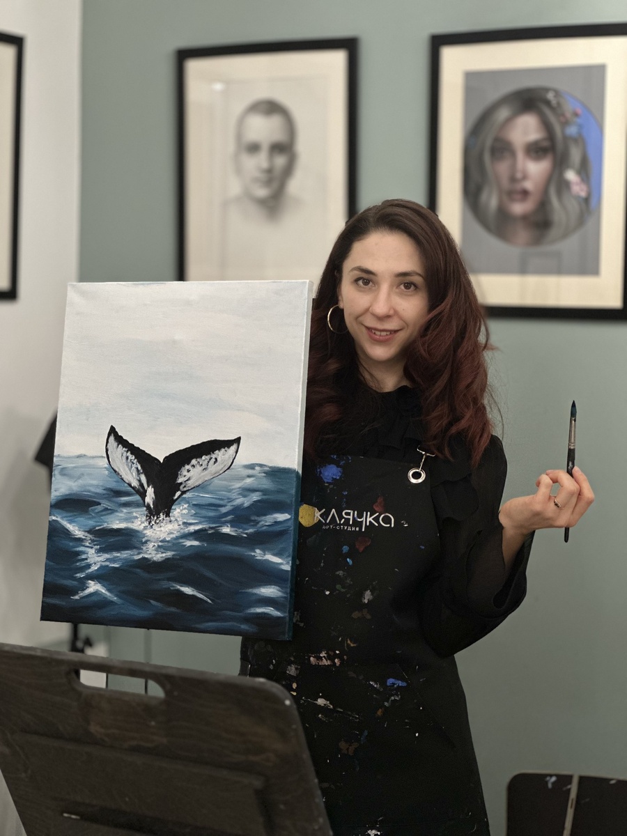 Итак, интрига бешеная раскрыта! Я писала море и кита. Потому что мне понравилась эта лаконичность и глубина. И китов я люблю. Они – особенные✨ Вчера следила за голосованием и прям переживала. Спасибо той четвёрке оптимистов, которые решили, что я рисовала лес и горы. Боюсь, я бы их до пенсии не дорисовала своей рукой из причинного места 😂 Дерево в лунном свете тоже очень красивое, но я не такая загадочная натура. Самая большая конкуренция долгое время разворачивалась вокруг воздушных шаров и кита (благодаря моему голосу тоже, ахахаха). Но в итоге фрукт и кит сравнялись (не считая, опять же, мой голос). Из чего я делаю вывод, что а) вы меня хорошо знаете, и б) я яркая личность (и скромная)😂 Рисовать этот шедевр мне помогала мастер из студии «Клячка» Арина. Она сразу спросила, хотим мы уйти с чем-то красивым или научиться писать акварелью. И я реалист: за 2 часа научиться этому нереально, но я хочу хороший результат, поэтому с удовольствием принимаю помощь. И не считаю, что это те