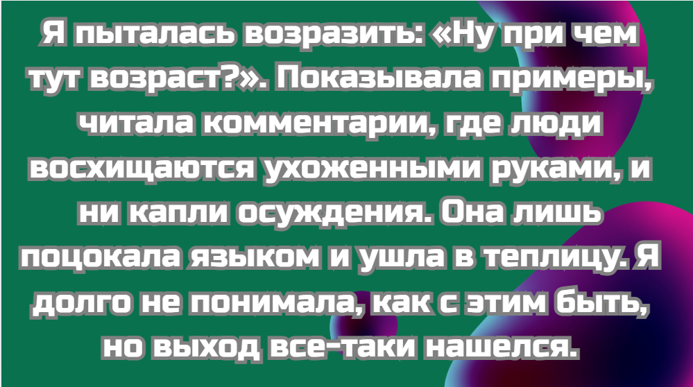 Я пыталась возразить: «Ну при чем тут возраст?». Показывала примеры, читала комментарии, где люди восхищаются ухоженными руками, и ни капли осуждения. Она лишь поцокала языком и ушла в теплицу. Я долго не понимала, как с этим быть, но выход все-таки нашелся.