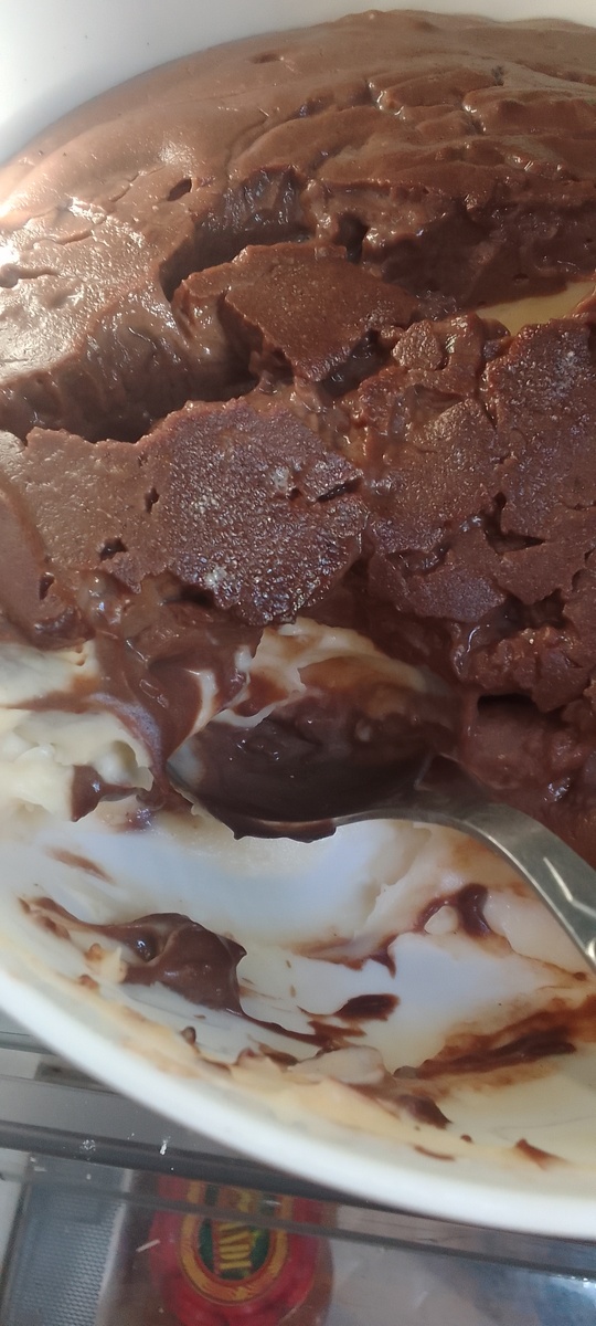Если захотелось чего-то сладенького и относительно легкого, то это оно! По сути, это заварной крем, но с нюансами) Растапливаю на небольшом огне 120 г сливочного масла и добавляю в него 1 ст. пшеничной муки. Быстро перемешиваю и начинаю добавлять молоко в количестве 1 литра. Постепенно, разбивая образующиеся комочки. Когда все хорошо перемешано, добавляю 1 ст. сахара. Довожу до закипания на медленном огне. Лучше все это делать в сотейнике с толстым дном, а еще лучше – на водяной бане. Иначе подгорания вряд ли можно будет избежать. Накрываем пленкой и охлаждаем. Смешиваю в кастрюльке 500 мл молока, 1 яичный желток, по 2 ст.л. муки и хорошего какао, 3 ст.л. сахара. Довожу смесь до кипения (тоже на водяной бане). После того, как сняла с огня, добавляю 30 г сливочного масла и 60 г горького шоколада. Хорошо перемешиваю и тоже охлаждаю. Выкладываю в глубокий салатник белую заварную массу, а сверху – шоколадную. Через ситечко посыпаю поверхность небольшим количеством какао. В оригинале еще у