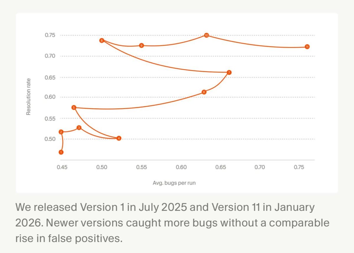 Агент bugbot от Cursor показал значительный рост эффективности: resolution rate увеличился с 52% до 70%, а среднее количество обнаруженных багов за запуск — с 0.4 до 0.7. Доля разрешённых багов на pull request выросла с 0.2 до 0.5, что в 2,5 раза выше начальных показателей. Для достижения таких результатов потребовалось около 40 итераций экспериментов и доработок. Наибольший эффект дало использование нескольких представлений diff’а: • обычный unified diff • diff с расширенным контекстом (код до и после) • diff словами Несколько независимых проверок объединяются агентом для повышения точности. https://dzen.ru/id/5c0e38ff46ef5c00aaa80527