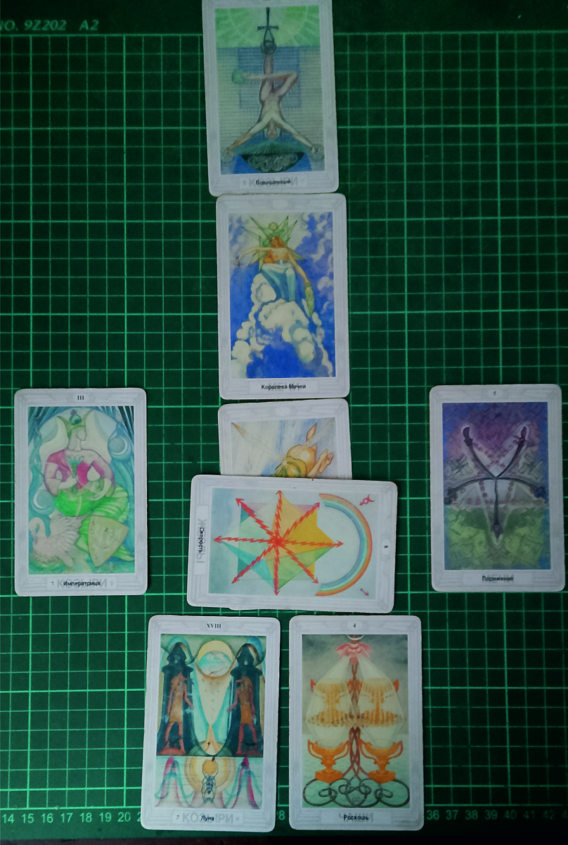 Зеркало только отражает, но не судит. Мы смотрим в зеркало и делаем свои выводы, качество зеркала не влияет на результаты наших выводов. Мы просто можем себя убедить, обмануть или настроить. А зеркало к этому процессу имеет очень опосредованное отношение. Вы сегодня - рыцарь ветра. В моём представлении, если хотите - в интерпретации или трактовке. То есть, об отражении в зеркале рассказываю Вам я, и опять прошу Вас, пробуйте смотреть на отражение сами, это увлекательное занятие заставит видеть правду между отблесков. Направление - сверху вниз налево. Слева - прошлое, внизу - основы, данные нам предками в широком смысле слова, наверху - ассоциации, взятые нами из прожитой жизни, эффектные, но не факт, что верные. Консервативность, отсутствие стратегии, вспыльчивость. Над Вами - сегодняшняя реальность. Восемь - много, жезлы - огонь, движение, энергия. Жезлы, конечно, не козырь, их и поправить можно, если очень захотите. А время, как будто заведённое, движется в одном направлении. III
