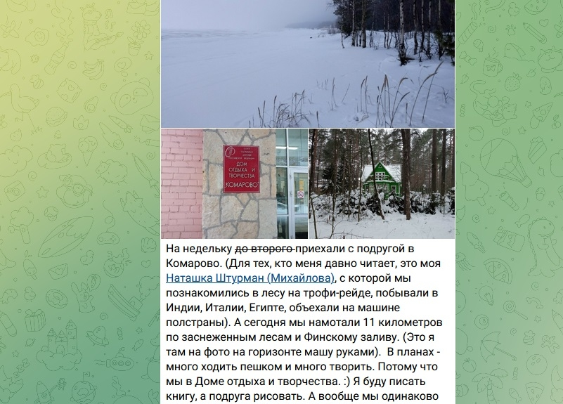 Уехали с подругой на недельку в Комарово. Читатели моего телеграм-канала уже полностью в курсе, вчера наблюдали процесс-онлайн. Мне проще всего вести именно его, он самый мобильный. Живем в Доме отдыха и творчества. Мы с подругой некоторым образом тоже творческие люди, так что место для нас самое то. :) Прибыли вчера на электричке, заселились, осмотрелись. А потом долго гуляли - намотали 11 километров за день. Тут абсолютная зимняя сказка. На заливе, правда, холодно и сурово. Номер у нас небольшой, но мы тут только ночуем, а чтобы не мешать друг другу творить, уходим в разные места, их тут можно найти. Вот еще местечко. Есть совсем атмосферные места, например, я сегодня с утра писала книгу в шикарном каминном зале. В нем реально есть камин, хочу разъяснить - его вообще можно разжечь? А сейчас после обеда опять пойдем долго гулять. Кстати, о еде. Дом отдыха так-то в советские времена построен и устроен, и тут все немного в той атмосфере. Но вот еда прямо удивила. Здесь шведский стол