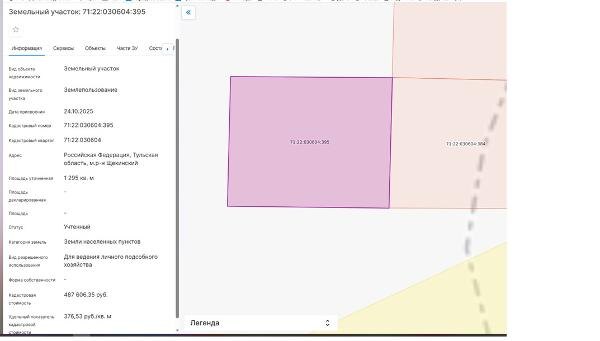 Название: площадью 1295 кв.м, с кадастровым номером 71:22:030604:395, категория земель «Земли населенных пунктов», местоположение земельного