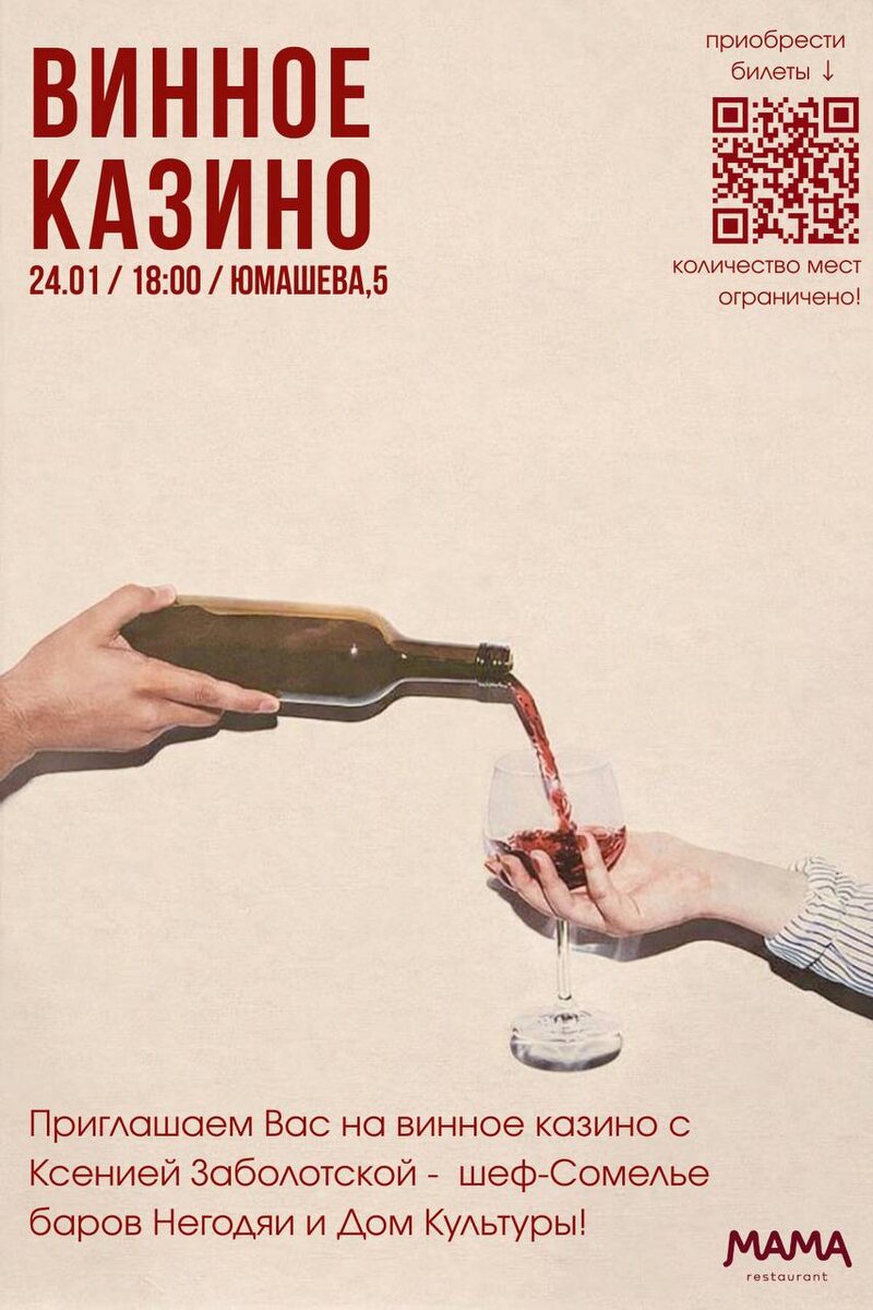 Настоящее казино. Вместо ставок — интуиция, вкус и удовольствие.Это вечер, где вино становится игрой. Где можно ошибаться, угадывать, смеяться и открывать новые вкусы! Игровая механика, интрига и азарт — и всё это вокруг вина. Дегустация вслепую, неожиданные открытия и ощущение вечера, где хочется быть внутри процесса, а не просто наблюдать. Ведёт игру Ксения Заболоцкая — шеф-сомелье баров «Негодяи» и «Дом культуры». 📅 24 января 🕕 18:00 📍 Юмашева, 5 🎟 Билеты — по QR-коду * количество мест ограничено* В такие игры не играют большими компаниями. Именно поэтому количество мест ограничено. Ждем каждого!🖤