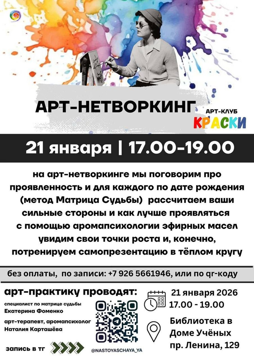 🎨 @kraski_art_fest 💛давайте знакомиться💛 🗓21 января 2026 ⏰17.00-19.00 📍Библиотека в Доме Учёных Обнинск, пр-т Ленина, 129 💰 без оплаты, по записи 📒 запись @nastoyaschaya_ya На арт-нетворкинге мы будем разбирать, как вас считывают люди с первых секунд — и как использовать это в свою пользу. Мы опираемся не на шаблонные советы, а на ваши личные сильные стороны, определённые по дате рождения. Что вы узнаете: - как вас лучше всего воспринимают окружающие - какой способ самовыражения у вас самый продающий - через что вам легче всего заявлять о себе и привлекать людей По вашей матрице судьбы (нужна будет только дата рождения) мы смотрим две ключевые точки: - точку образа — как вас видят и чувствуют люди - точку таланта — через что вам лучше всего проявляться и продавать себя Вы получаете расшифровку и рекомендации: как именно вам использовать это в реальной самопрезентации, речи, знакомствах и нетворкинге Найдём свои точки роста в проявленности через аромапсихологию и, конечно