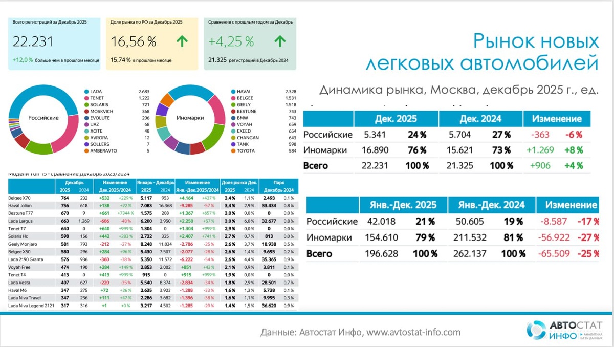Как сообщают в «Автостат Инфо», в декабре 2025 года московский рынок новых легковых автомобилей немного вырвался вперед по сравнению со страной в целом. При общероссийском росте на 11% к декабрю 2024 года Москва прибавила только 4%, однако ее вклад в федеральный результат заметно увеличился. В столице было зарегистрировано 22 231 новый автомобиль против 21 325 годом ранее, а доля московских продаж в российском рынке за месяц поднялась до 16,5%. На авторынке Москвы формально большинство по-прежнему за иностранцами. На их долю пришлось 16 890 авто, это 76% рынка и плюс 8% к результату декабря 2024 года. Российские марки, напротив, показали небольшое проседание: 5 341 регистрация, 24% рынка и -6% к прошлому году. То есть прирост декабрьского спроса фактически обеспечили иномарки, а отечественный сегмент сыграл роль стабилизатора, но не драйвера. За весь 2025 год в Москве зарегистрировано 196 628 новых легковых автомобилей, что на четверть меньше уровня 2024 года (минус 65 509 ед.). Силь