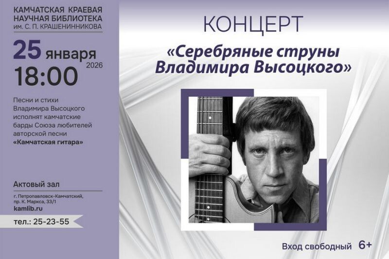 25 января, в день рождения Владимира Высоцкого, его песни и стихи прозвучат в исполнении бардов Союза любителей авторской песни «Камчатская гитара», передаёт РАИ «КАМЧАТКА-ИНФОРМ». Концерт «Серебряные струны Владимира Высоцкого» (6+) состоится в Камчатской краевой научной библиотеке им. Крашенинникова. Он стал знаменитым благодаря авторским песням, которые отличались разнообразием тем и остротой смыслового подтекста. В них звучала акцентированная социально-нравственная позиция поэта, которая находила отклик в сердцах слушателей. «Песни и стихи Владимира Высоцкого продолжают жить и звучать. Исполнение отличалось особой энергетикой и эмоциональностью, что делало каждую песню уникальной. А тематика настолько многогранна, что композиции нашли отклик у людей разных возрастов и социальных слоев», – рассказали в библиотеке. Начало концерта в 18 часов. Вход свободный. 🟠 КАМЧАТКА-ИНФОРМ — новости Камчатки в Telegram 🟠 Фоторепортажи и эксклюзивные материалы на kamchatinfo.com 🟠 НАПИСАТ