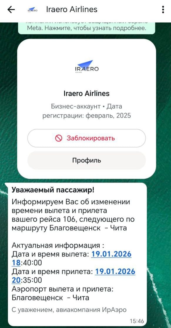 Одна из пассажирок рейса № 106 «Благовещенск — Чита» авиакомпании «ИрАэро» рассказала @chita.ru, что они не могут улететь уже почти 5 часов. В «ИрАэро» пояснили, что задержка связана с неисправностью самолёта. По данным онлайн-табло читинского аэропорта, борт должен был прилететь в 17:50, но теперь его ожидают в 22:35. Этот самолёт выполняет рейс по маршруту Владивосток — Благовещенск — Чита — Иркутск. Из Читы в Иркутск он вылетит в 23:20 вместо 18:50. ➡️ Вчера самолет этой же компании из Иркутска в Читу задержали на 10 часов. Тогда это объяснили тем, что борт вовремя не вернулся в Иркутск из предыдущего полета. Сегодня самолет до Читы задержали вновь, он опоздал на 6 часов. @chita.ru узнает причины. Скриншот от пассажира 🟦 Подписаться