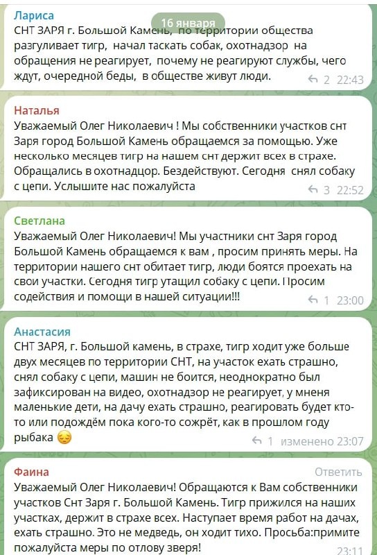 По их словам, хищник разгуливает в районе СНТ «Заря» несколько месяцев и не боится людей и машин. В охотнадзоре отметили, что проверку провели и уже начали отлов тигра. Местные в 4-х комментариях рассказали о том, что жители боятся ехать на свои дачи и тем более брать с собой детей. Некоторые из страха за свою жизнь снимают с цепи собак. По данным Охотнадзора, выход амурского тигра обусловлен в том числе наличием большого количества бездомных собак на территориях СНТ. Также там нет освещения и ограждений на дачных участках, которые примыкают к лесу почти вплотную. Однако люди настаивают, что бездомных собак на территории они не видели, а хищник утащил домашнюю собаку, сидящую на цепи. Перепрыгнул через забор и уволок животное с собой. Специалисты заверили, что работа ведется и это не быстрый процесс. Жителям СНТ надо тоже предпринять меры осторожности, например, закрывать собак на ночь в доме или другом помещении, если забор достаточно низкий для тигра. Поставить на территории датч