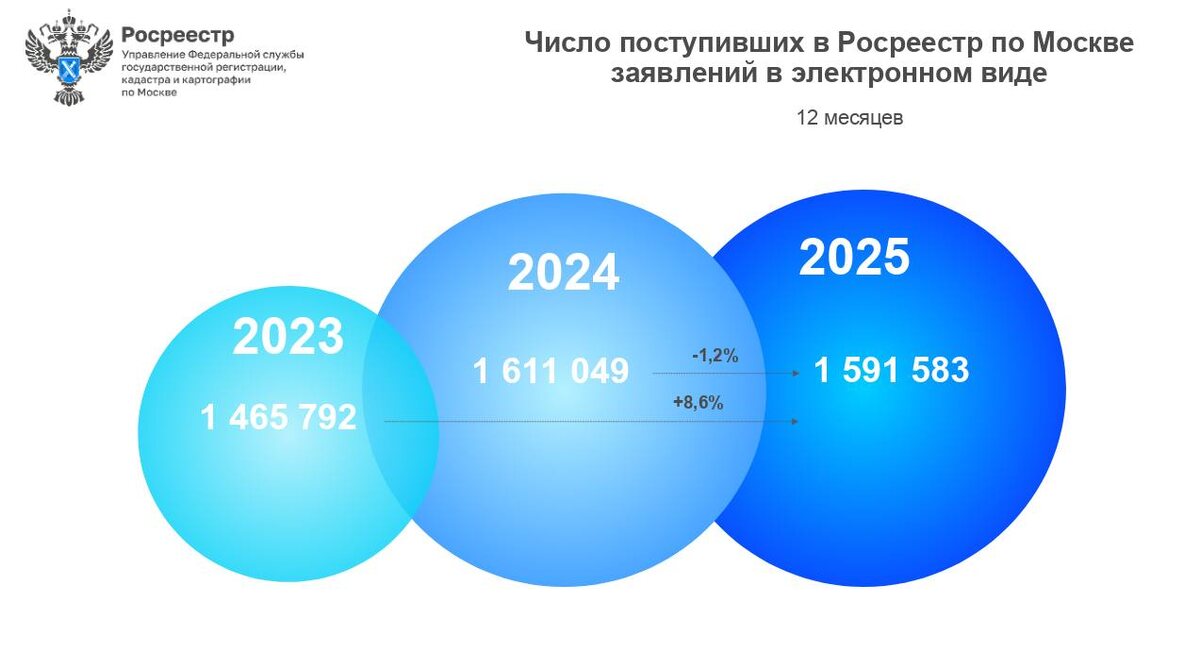 За 12 месяцев 2025 года Управлением Росреестра по Москве принято 1 591 583 заявления в электронном виде на регистрацию прав и постановку на кадастровый учет объектов недвижимости. Об этом сообщил руководитель Управления Росреестра по Москве Игорь Майданов. Показатель сопоставим с аналогичным периодом прошлого года с разницей в 1,2% (1 611 049 онлайн-заявлений в 2024 году). При этом к январю-декабрю 2023 года (1 465 792) рост составил 8,6%. В декабре 2025 года Управлением Росреестра по Москве принято 160 053 заявления в электронном виде. К предыдущему месяцу (106 382) рост составил 50,5%. При этом показатель декабря стал вторым в году после максимального апрельского значения (161 046). К аналогичному месяцу прошлого года (172 258) снижение составило -7,1%, а к декабрю 2023 года (145 487) показатель вырос на 10%. «Прошедший год продолжил устойчивый тренд на популярность цифровых сервисов среди пользователей услуг Росреестра, даже несмотря на умеренную активность рынка недвижимости во