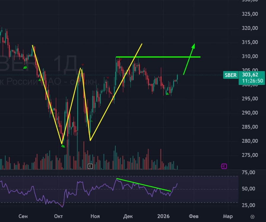 🏦 СБЕР 🟢 Сегодня Сбер показывает хорошую динамику. Завтра у СБЕР отчет, возможно, его заранее выкупают под это событие. 🟢 В прошлом посте, в пятницу, я показывал, что на 4-х часах есть конвергенция. Сегодня ее отработали, но на дневках у нас есть еще потенциал для роста. 🟢 На дневках есть двойное дно (отметил желтым), но эта фигура не отработалась, т.к. не смогла пробить 310 руб. Сбер трижды бился в этот уровень без результатно. В данный момент, он уже значительно остыл по RSI, ломает на ней наклонку, и готов к новой атаке уровня. 🚗 Жду СБЕР на 310, а также жду пробой этого уровня, для отработки двойного дна. Весь позитив скорее всего будет на геополитике. #сбербанк #sber #sbrf #sberf #сбер #bogdanoffinvest $SBER $SRH6 $SRM6 $SBERF