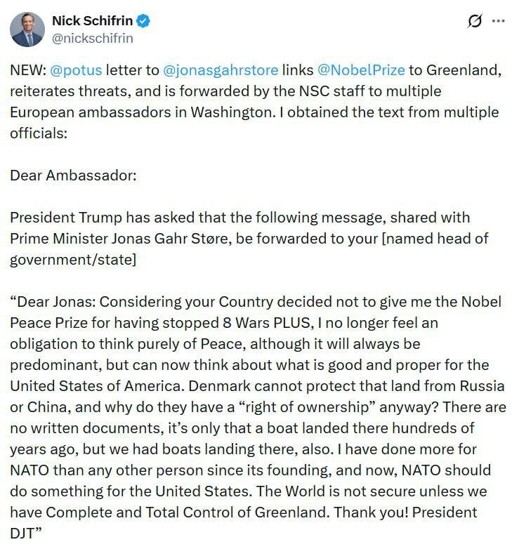 🇺🇸 Трамп заявил, что больше не обязан «думать только о мире» и хочет получить Гренландию