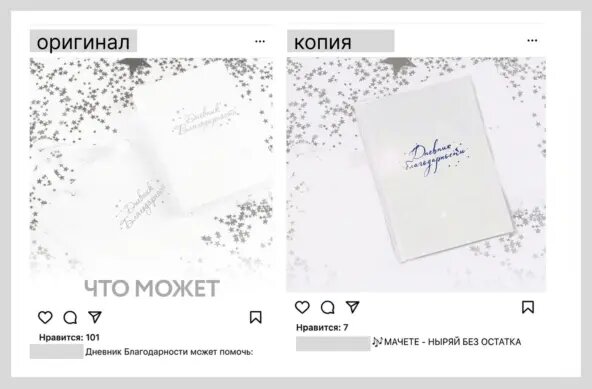 Однажды, изучая похожие продукты на маркетплейсе, А. обнаружила практически полную копию своего Дневника. Идентичное оформление карточки товара (при том, что товар клиента был только на ее сайте) — все было скопировано с минимальными изменениями.