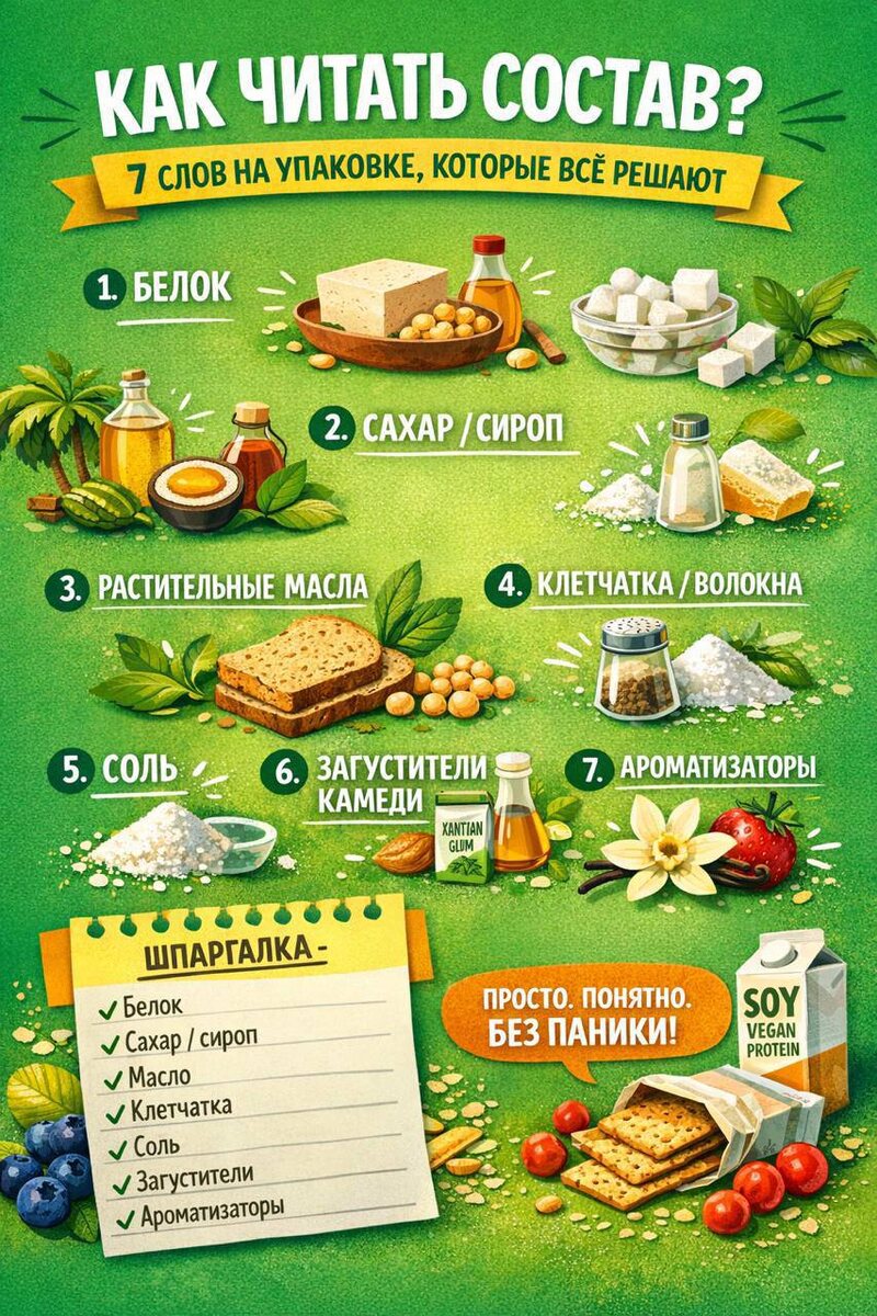 Состав на упаковке часто выглядит как “список непонятных слов”, из-за чего многие либо игнорируют его, либо пугаются раньше времени. Но на практике, чтобы понять продукт, достаточно 7 пунктов, на которые стоит смотреть в первую очередь. 1) Белок Для постного рациона это ключевой ориентир: белок влияет на сытость, восстановление и стабильный аппетит. ✅ Хороший признак, когда белок действительно присутствует и продукт позиционируется честно: “белковый” = значит, белка заметно. ⚠️ Если продукт “обещает сытость”, но белка мало, это чаще маркетинг, чем польза. 2) Сахар и его “маски” Сахар может называться по-разному: сахар, сироп, глюкоза, фруктоза, декстроза, мальтодекстрин. ✅ В несладких продуктах сахара обычно нет или он находится ближе к концу списка. ⚠️ Если сахар/сироп стоит в начале состава, то продукт может давать “качели”: быстрое удовольствие → быстро снова хочется сладкого. 3) Растительные масла Масло в составе — нормально. Важно, какое масло и сколько его. ✅ Когда масло допол