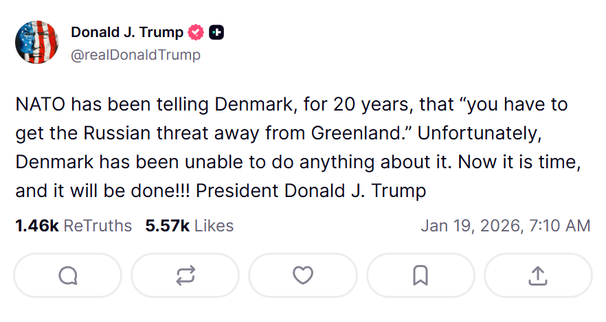 Трамп намерен устранить "российскую угрозу" от Гренландии. Об этом он заявил на своей странице в Truth Social. "НАТО уже 20 лет твердит Дании, что "вы должны устранить российскую угрозу от Гренландии". К сожалению, Дания ничего не смогла с этим поделать. Теперь пришло время, и это будет сделано".