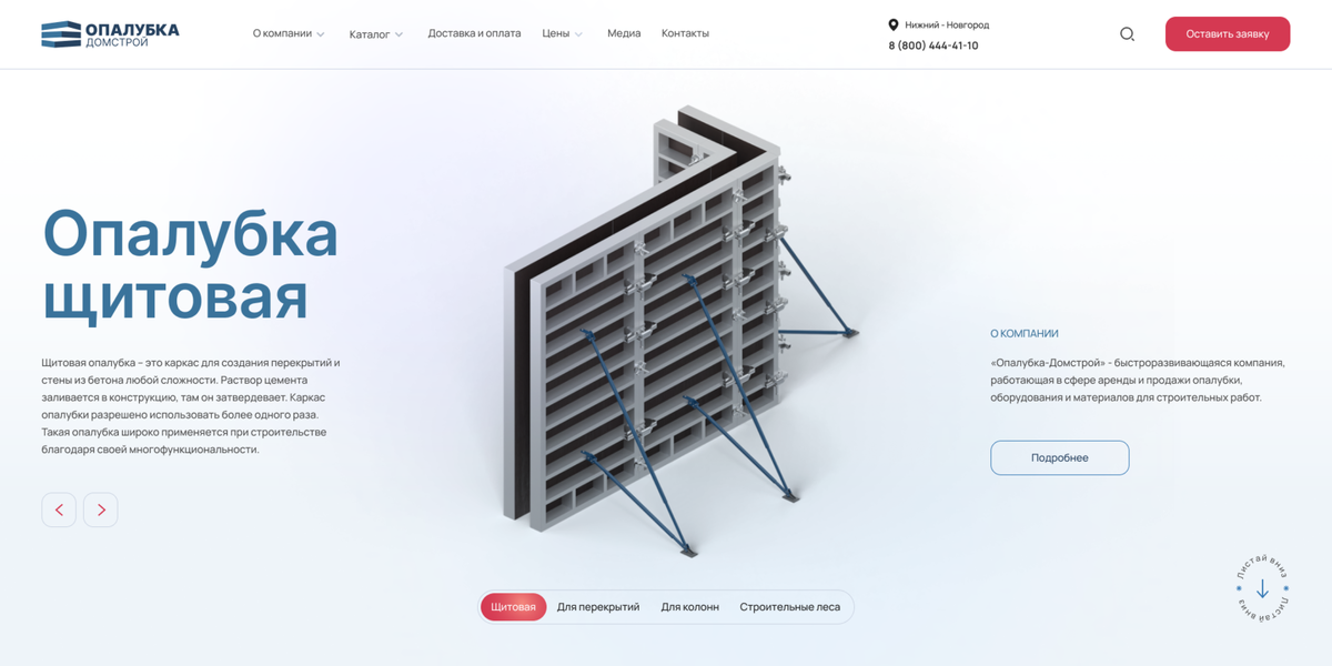 Главное при разработке сайтов поставщиков оборудования — сделать удобный информативный каталог и отстроиться от коллег из той же ниши за счет нестандартных дизайнерских решений. В этом проекте реализованы обе задачи, и новый сайт «Опалубка-Домстрой» стал полезным инструментом для бизнеса, работающего в высококонкурентной среде.