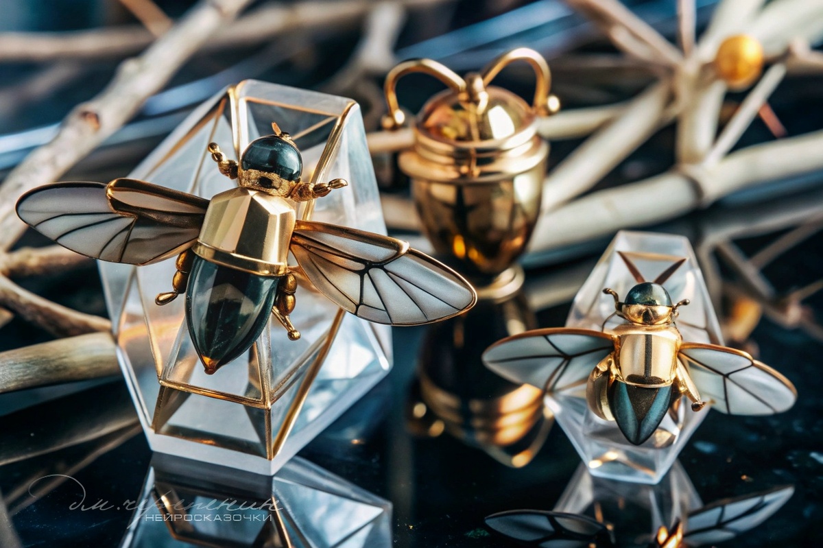 Серьги «Бесконечная Метаморфоза»: Из золота, серебра и прозрачного акрила. Одна серьга — это муравей Эшера, выложенный из геометрических золотых пластин, карабкающийся по мёбиусной ленте из серебра. Вторая — его парный, но зеркально отражённый двойник, который движется «вниз», нарушая все законы перспективы. Внутри прозрачных сегментов тела — крошечные, как пыль, опалы, мерцающие радугой. Кольцо «Беглец»: Массивное, из жёлтого и белого золота, в форме паука-скакуна. Его длинные, ажурные ноги, сплетённые в невозможных узлах, обхватывают палец. Брюшко — это вращающийся кристалл дымчатого кварца, внутри которого, при увеличении, виден микроскопический гравюрный автопортрет самого Эшера, вглядывающегося в свою же руку, держащую лупу... и так до бесконечности.
