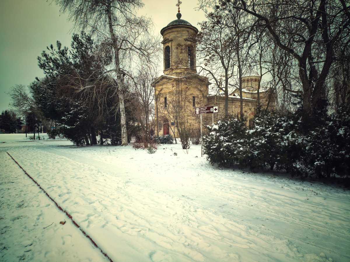 Холодно, сурово, но именно в этой строгой зимней простоте скрыта особая красота. Снег здесь уже утоптан: следы людей, голубей и машин переплетаются в сложный узор.