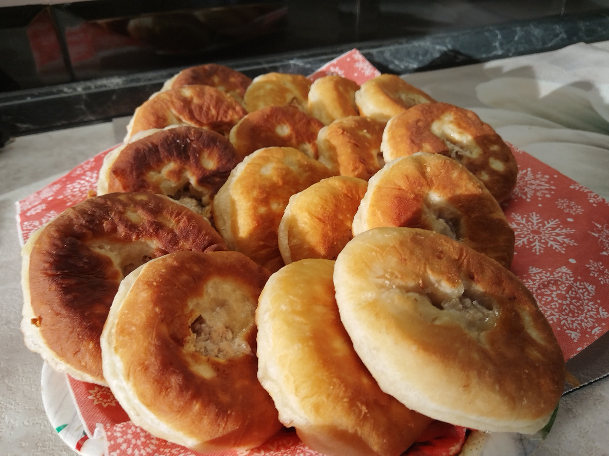 **Ингредиенты:** **Для теста:** - Мука — 500 г - Сухие дрожжи — 1 ч. л. - Тёплая вода — 200 мл - Молоко — 100 мл - Сахар — 1 ст. л. - Соль — 1 ч. л. - Растительное масло — 3 ст. л. **Для начинки:** - Фарш (свинина/говядина) — 400 г - Лук — 1 крупная луковица - Чеснок — 2 зубчика (по желанию) - Соль — по вкусу - Чёрный молотый перец — по вкусу - Вода — 50 мл **Для жарки:** - Растительное масло — около 200 мл --- **Пошаговый рецепт:** **Приготовление теста:** 1. В небольшую миску налить тёплую воду, добавить сахар и дрожжи. Хорошо перемешать и оставить на 10–15 минут, пока дрожжи не начнут пениться. 2. В большую миску просеять муку, добавить соль. Влить дрожжевую смесь, тёплое молоко и растительное масло. 3. Замесить мягкое и эластичное тесто, которое не будет прилипать к рукам. 4. Накрыть тесто полотенцем и поставить в тёплое место на 40–50 минут для подъёма. **Приготовление начинки:** 1. Лук и чеснок (по желанию) мелко нарезать. 2. Добавить их в фарш, посолить и поперчить по вкусу. 3.