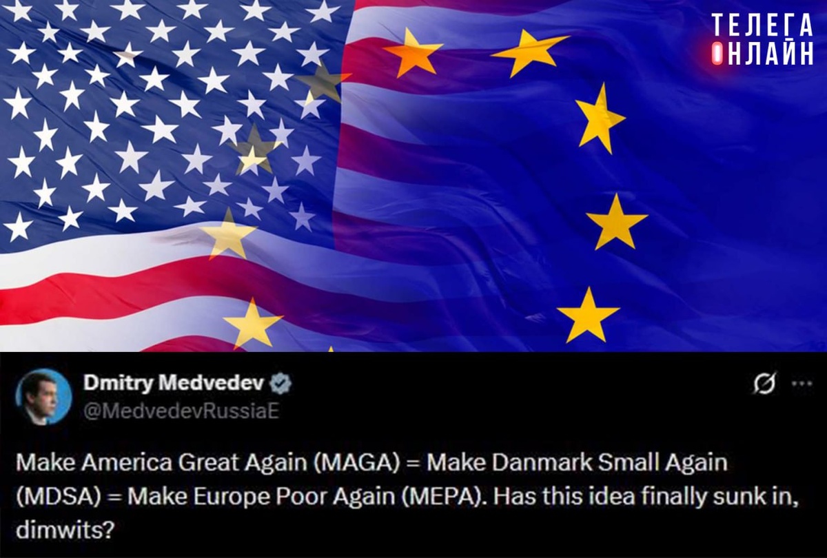 Дмитрий Медведев переживает за евроатлантическое единство: Сделаем Америку снова великой (MAGA) = Сделаем Данию снова маленькой (MDSA) = Сделаем Европу снова бедной (MEPA). Неужели до вас наконец дошла эта идея, болваны? Не видим минусов. 🚲 Подпишись на Телега Online