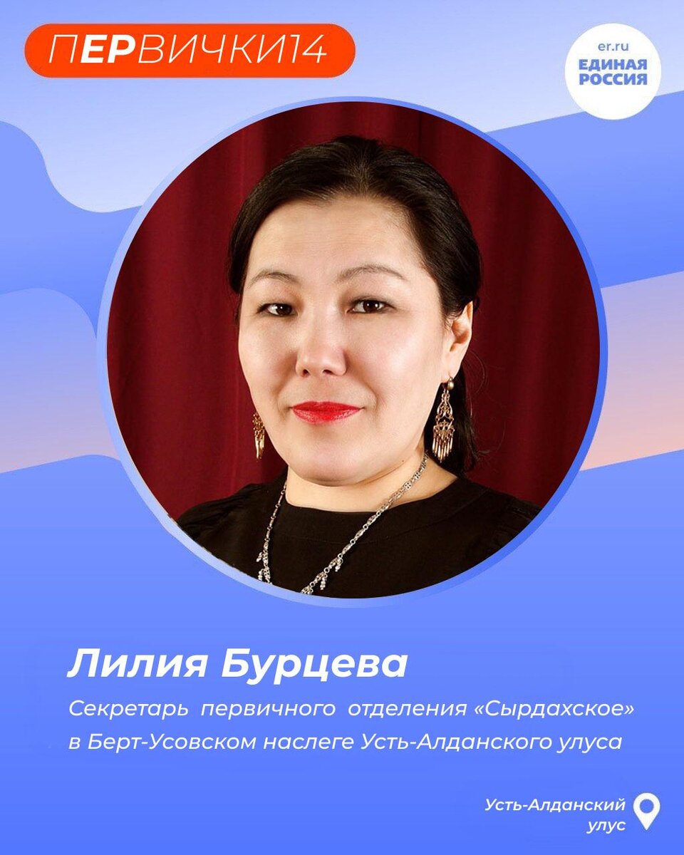 А.П. Иванова. С 2018 года избрана секретарем первичного отделения «Сырдахское». В Берт-Усовском наслеге проживают около 700 жителей Значимым событием стало участие в конкурсе общественных проектов первичных отделений Партии «Единая Россия». Защитили проект и приобрели оборудование для филиала Дома ремесел. Проект называется «Приобретение пневмомолота для филиала кузнецов Дома ремесла Усть-Алданского улуса». Сейчас это ведущий филиал по кузнечному делу в сельском поселении. Лилия Лазаревна более 20 лет работает в сфере культуры, 10 лет была лидером молодежного движения, с 2005 года депутат наслежного Совета Берт-Усовского наслега, Отличник культуры РС(Я), делегат Всероссийского съезда директоров (г.Пятигорск), делегат XI,XII,XV съездов женщин РС(Я), делегат II съезда представительных органов муниципальных образований РС(Я). #ЕдинаяРоссия #ЕР14 #Первички14 🤩 Подпишитесь на наш канал в MAX!