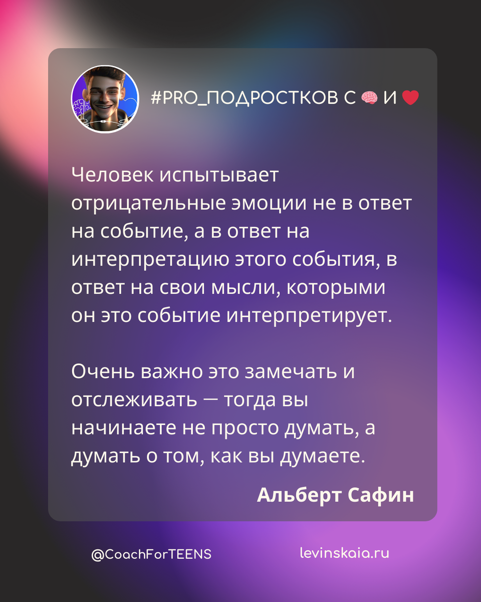 #мысль_дня Человек испытывает отрицательные эмоции не в ответ на событие, а в ответ на интерпретацию этого события, в ответ на свои мысли, которыми он это событие интерпретирует. Очень важно это замечать и отслеживать — тогда вы начинаете не просто думать, а думать о том, как вы думаете. Альберт Сафин