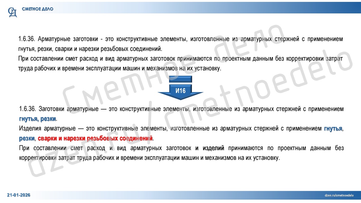 В ходе вебинара "Сметное дело. Выпуск 23" при обзоре ФСНБ-2022-И16 (приказ Минстроя России от 12.11.2025 №696/пр) обратили внимание на новое изложение пункта 1.6.36 к ГЭСН 81-02-06-2022 "Бетонные и железобетонные конструкции монолитные". Однако, вопросы по разделу 08.4.03 "Сталь арматурная горячекатаная для железобетонных конструкций" (в частности по группам 08.4.03.02 и 08.4.03.03) продолжают поступать: Ранее мы уже поднимали вопросы по арматурным заготовкам, в которых "подсвечивали" нестыковки между ТЧ к ГЭСН06 и ФСБЦ: - Арматурные заготовки (часть II) (от 22.01.2025)