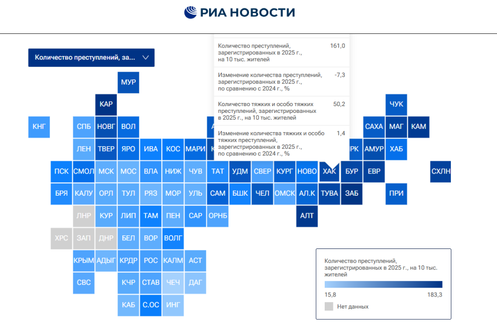 Хакасия вошла в десятку регионов с самым высоким уровнем преступности, мы на 76 строчке рейтинга (из 85) По итогам исследования, основанного на статистике МВД и Росстата за 2025 год, в республике на 10 тысяч населения зарегистрировано 161 преступление, особо тяжких — 50.