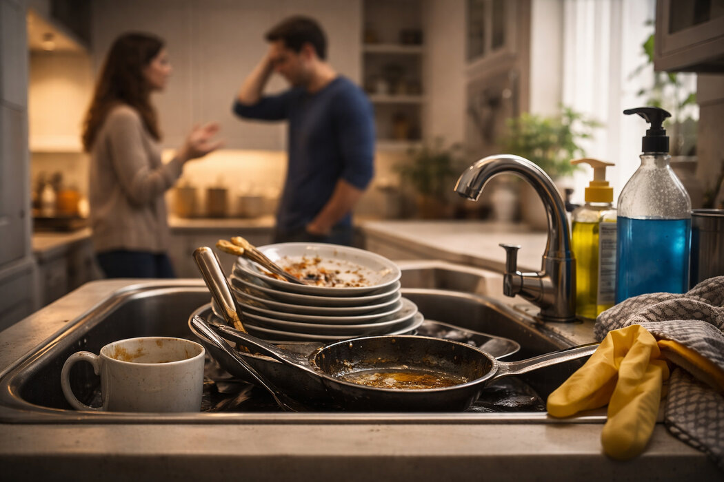 Ссоры из-за быта редко выглядят как что-то серьёзное. Немытая тарелка, неубранная кухня, разбросанные вещи, волосы в ванной, непостиранное бельё. Формально это мелочи. Но именно из-за них в парах накапливается хроническое раздражение, ощущение несправедливости и злость, которая со временем начинает касаться уже не тарелок, а самого партнёра. Главная ошибка в том, что люди воспринимают бытовые конфликты буквально. Кажется, что проблема именно в уборке. В том, что один делает больше, а другой меньше. В том, что кто-то неаккуратный, ленивый или безответственный. Но если смотреть глубже, бытовуха почти всегда является языком, на котором партнёры говорят о более сложных вещах. Для одного из партнёров быт часто становится маркером уважения. Если ты не убрал за собой, значит тебе всё равно. Если ты не заметил грязную раковину, значит ты не считаешь меня важной. Если я снова всё делаю одна, значит мои усилия обесцениваются. В этот момент злость направлена уже не на тарелку, а на ощущение, что