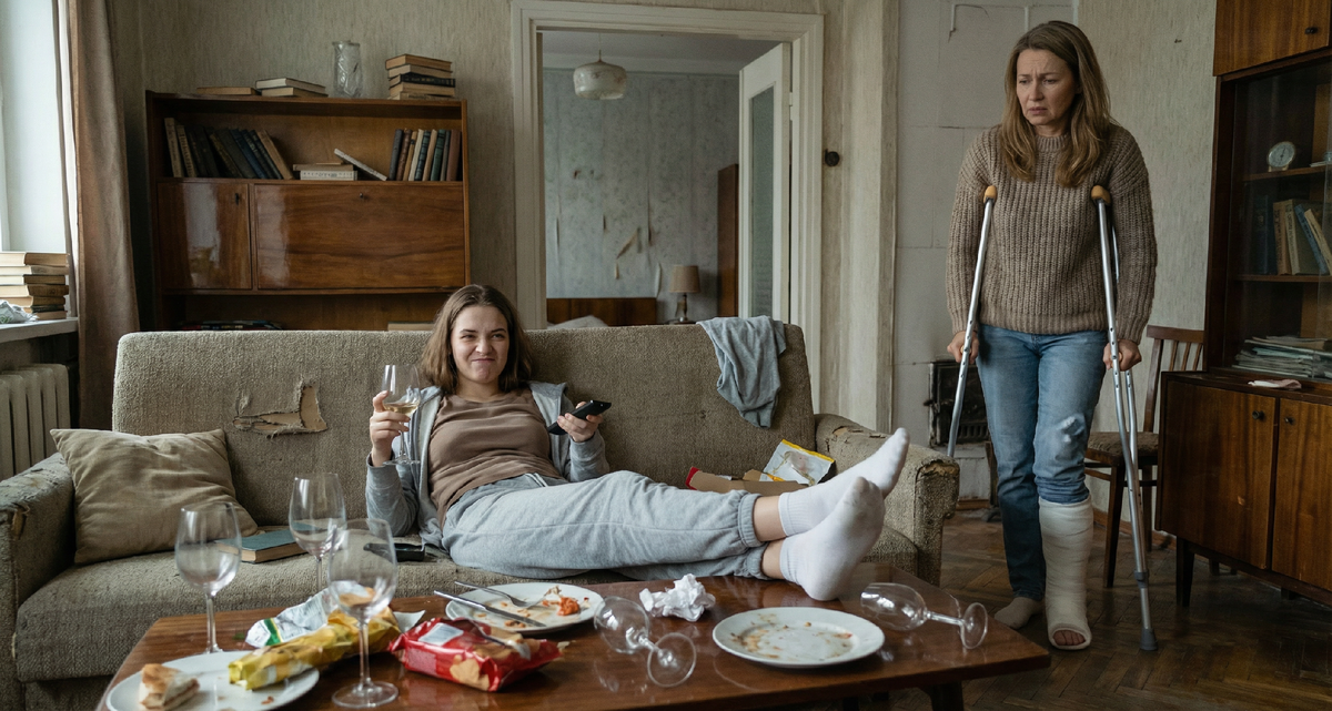Муж, как назло, улетел в длительную командировку на Север за два дня до этого. Я осталась одна в четырех стенах. Передвигаться на костылях — то еще удовольствие: пока дойдешь до кухни, уже устала. А чашку чая донести до дивана — это вообще цирковой номер, все расплескивается.