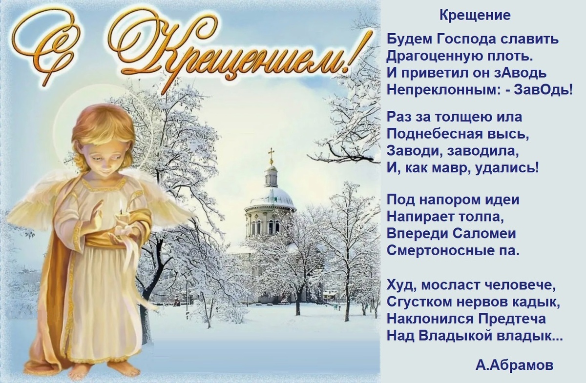 Крещение Будем Господа славить Драгоценную плоть. И приветил он зАводь Непреклонным: - ЗавОдь! Раз за толщею ила Поднебесная высь, Заводи, заводила, И, как мавр, удались! Под напором идеи Напирает толпа, Впереди Саломеи Смертоносные па. Худ, мосласт человече, Сгустком нервов кадык, Наклонился Предтеча Над Владыкой владык... А.Абрамов