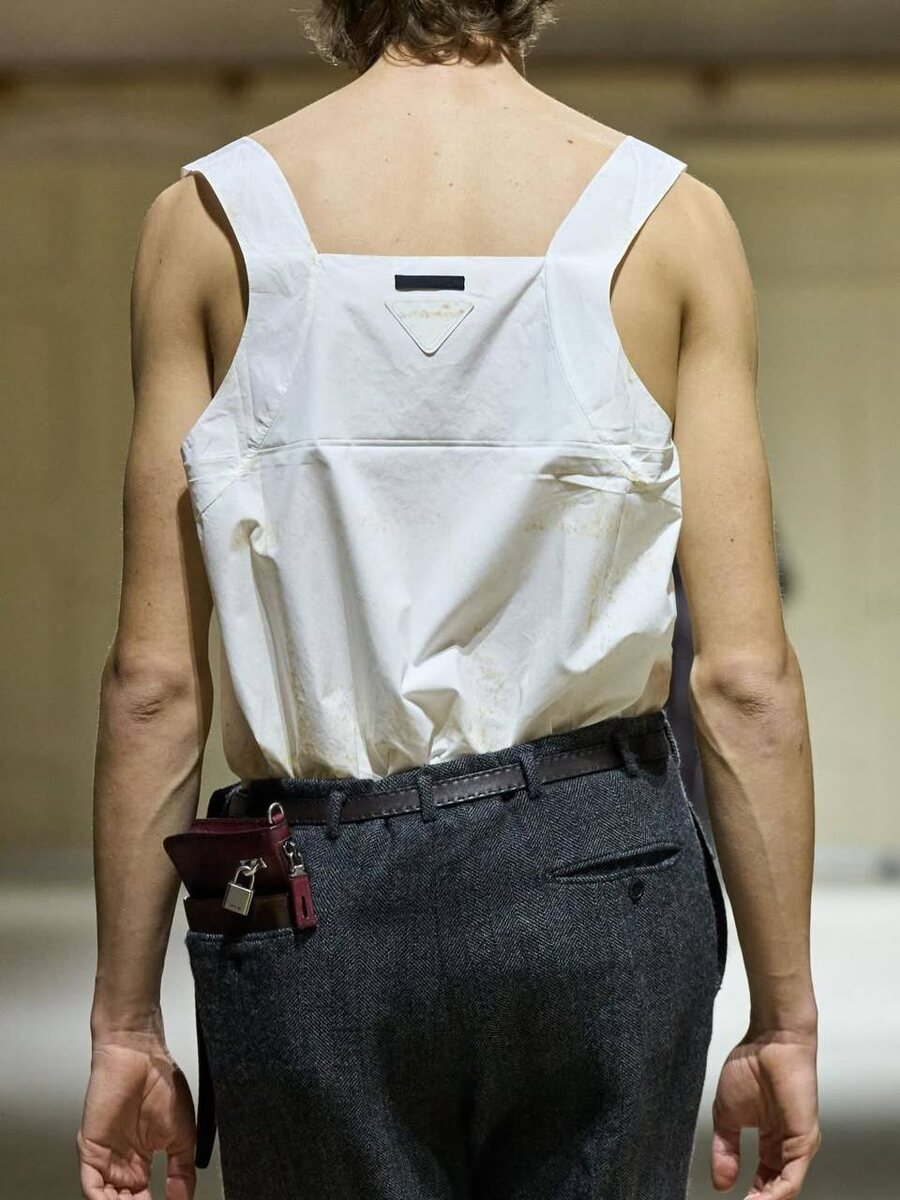 Фирменные спины Prada: топы и рубашки задом наперед, мятые вещи с заломами и «клошар делюкс»: потертости на тканях, из-под которых