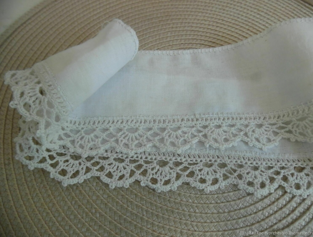 Кружево кайма тесьма СССР х/б для косынки, сарафана, нижней юбки, салфеток, дорожки, для любых интерьерных фантазий. Ручная вязка. Универсальный узор, повторю в нужном Вам цвете. Длина 180 см, ширина 3 см кружево + 6см х/б основа.