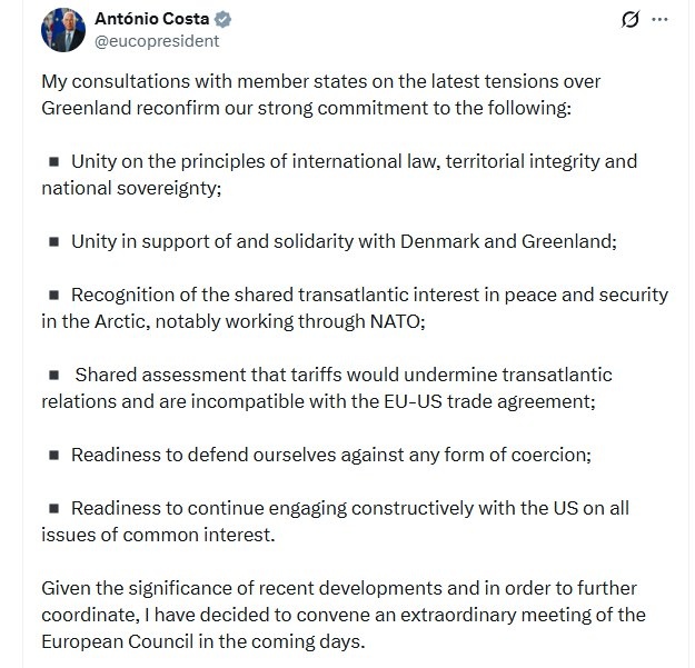EC president Costa wants 'to convene an extraordinary meeting of the European Council' over Greenland tensions