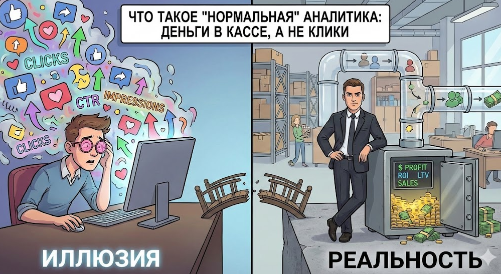 Давайте будем честны друг с другом. Большинство отчетов, которые предприниматели получают от своих маркетологов или агентств - это красивая, дорогая галлюцинация. Я вижу это постоянно: вам присылают презентации с графиками роста охватов, снижения цены клика (CPC) и увеличения CTR. Вы киваете, смотрите на эти зеленые стрелочки, направленные вверх, а потом открываете банковское приложение и не понимаете, почему там нет аналогичного роста.